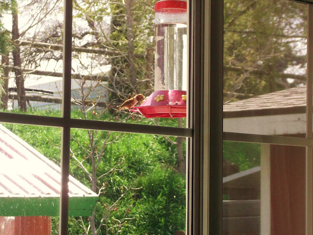 I finally decided it was warm enough to set out my hummingbird feeders and immediately found this pretty little baby drinking. Isn't she pretty? I do not see these pretty little brown hummingbirds too often.